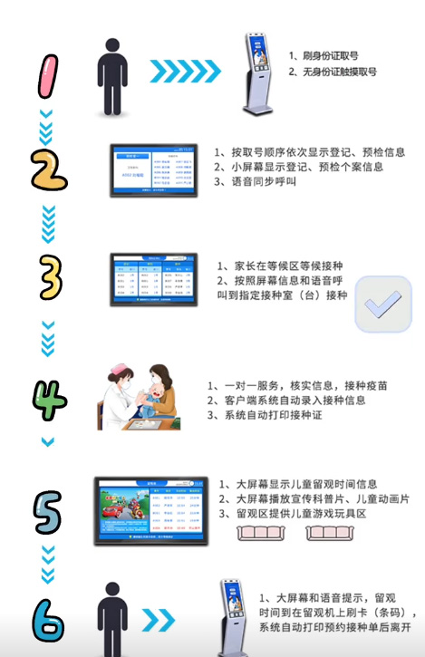 第一步,预防接种的叫号机刷身份证取号无身份证触摸取号两种方式。第六步,大屏幕名字显示和语音呼叫,留观时间到了后再机器上刷卡后系统自动打印预约接种单就可以离开。