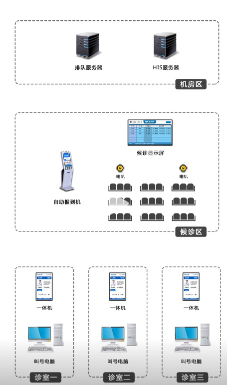 排队叫号系统图,机房区由排队服务器和叫号服务器组成。候诊区由自助报道一体机,播放喇叭候诊显示屏组成。诊室区由排队叫号显示一体机和呼叫电脑组成,同时服务器显示屏叫号一体机都是通过tcp联网。
